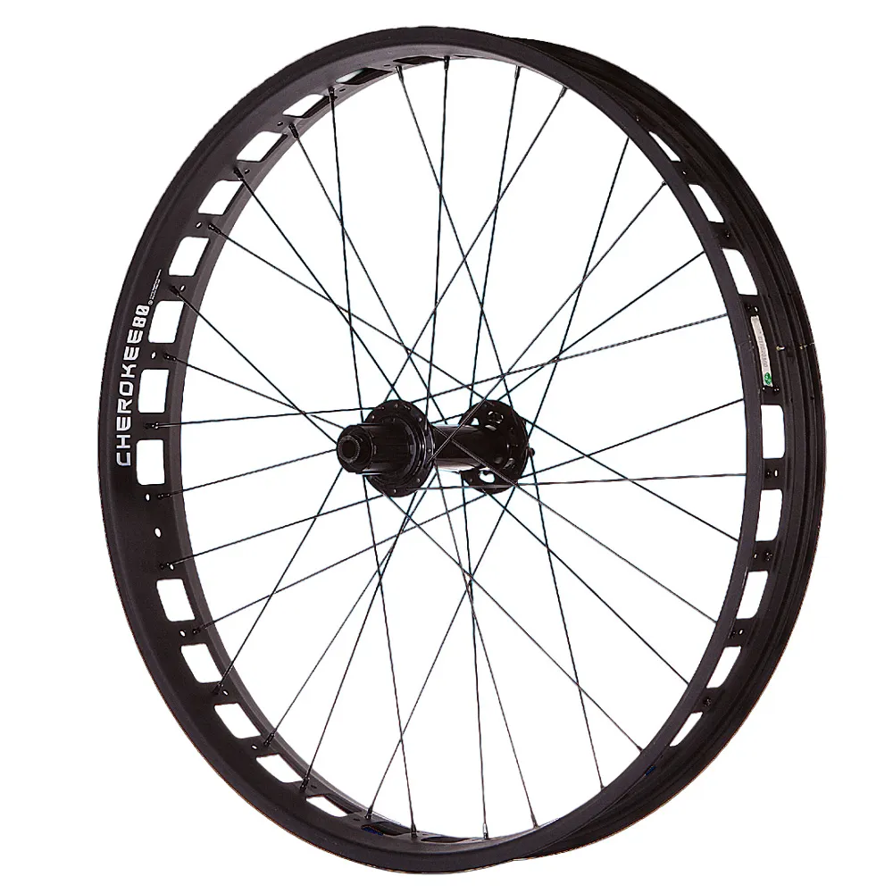 Alexrims Cherokee 80 26" rear wheel for fatbikes. Strong 12x197 mm hub, 6-bolt disc mount, and 74 mm internal width. Fits, among others, the Tunturi EMAX model.