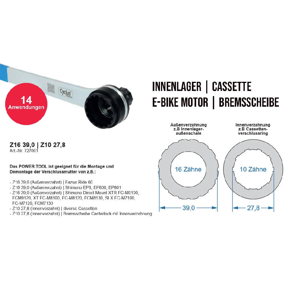Cyclus Tools POWER.TOOL Z16 39,0 | Z10 27,8 on kaksipuolinen asennus- ja irrotustyökalu, joka on suunniteltu erityisesti sähköpyörien moottoreiden ja keskiöiden huoltoon. Toinen puoli sopii ulkohampaisille lukkorenkaille (Z16 39,0) ja toinen sisähampaisille osille (Z10 27,8). Käytännöllinen vipuvarsi tarjoaa tehokkaan ja hallitun väännön ilman ylimääräistä rasitusta.