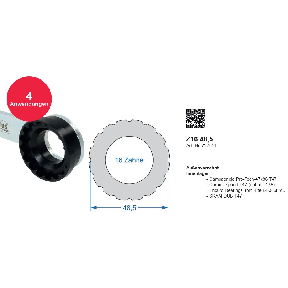 Cyclus Tools Z16 48.5 -avaustyökalu on korkealaatuinen erikoistyökalu keskiöiden lukitusrenkaiden irrottamiseen. Vipuvarrella varustettu malli tarjoaa erinomaisen tehonsiirron ja helpon käsittelyn. Sopii useisiin T47-tyyppisiin keskiöihin, kuten Campagnolo Pro-Tech, Ceramicspeed T47, Enduro Bearings Torq Tite BB386EVO ja SRAM DUB T47 -malleihin.